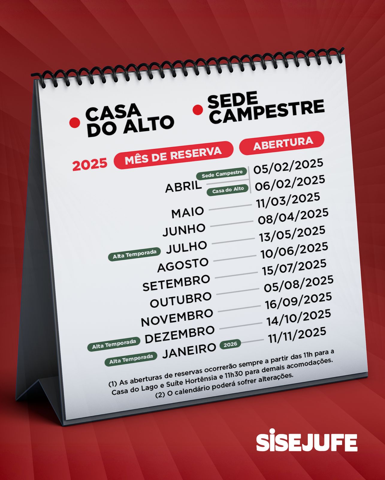 Vocês pediram e nós atendemos: agora os sindicalizados e sindicalizadas podem se programar com bastante antecedência para os dias de abertura das reservas na Sede Campestre e na Casa do Alto. Estamos disponibilizando um calendário com as datas até o mês de dezembro de 2025.