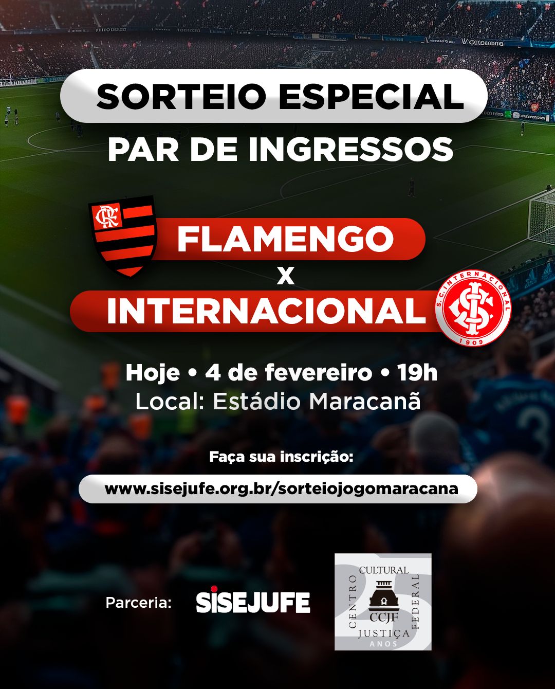 - Sisejufe e CCJF sorteiam par de ingressos para jogo Flamengo x Internacional, hoje (04/02), no Maracanã