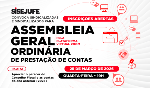 11/03/26 Sisejufe convoca sindicalizadas e sindicalizados para Assembleia Geral Ordinária de Prestação de Contas a ser realizada no dia 25/03, às 19h Reunião será pela plataforma Zoom; em pauta, o parecer do Conselho Fiscal e as contas do ano anterior (2025).