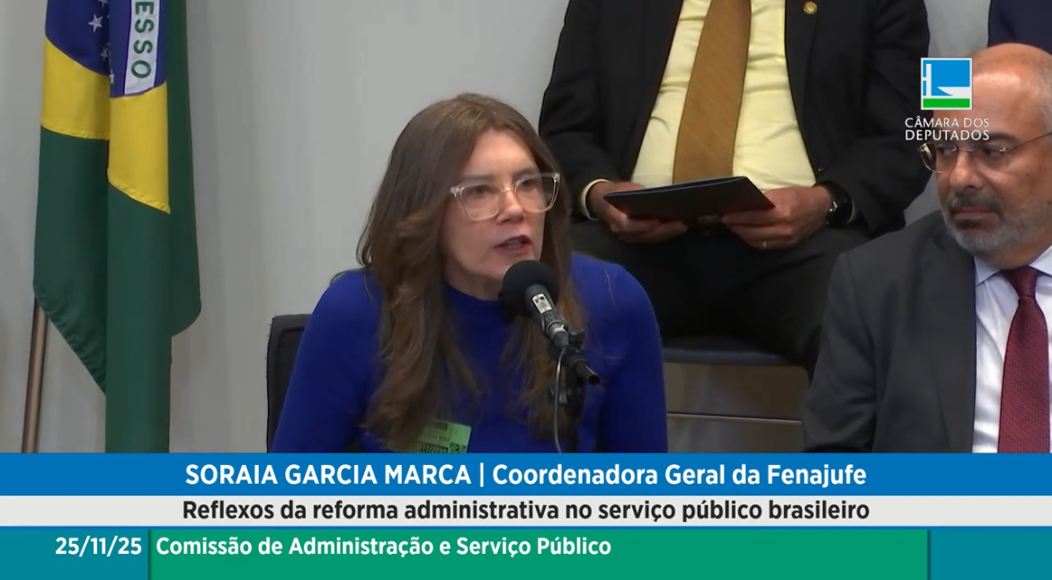 A coordenadora-geral da Fenajufe e diretora do Sisejufe, Soraia Marca, integrou a mesa principal da audiência pública sobre a Reforma Administrativa realizada na tarde desta terça-feira (25/11), na Câmara dos Deputados. O debate foi convocado pela deputada federal Alice Portugal (PCdoB-BA), coordenadora da Frente Parlamentar Mista do Serviço Público, e reuniu especialistas, entidades sindicais e representantes do funcionalismo para discutir os impactos da proposta sobre o serviço público brasileiro.