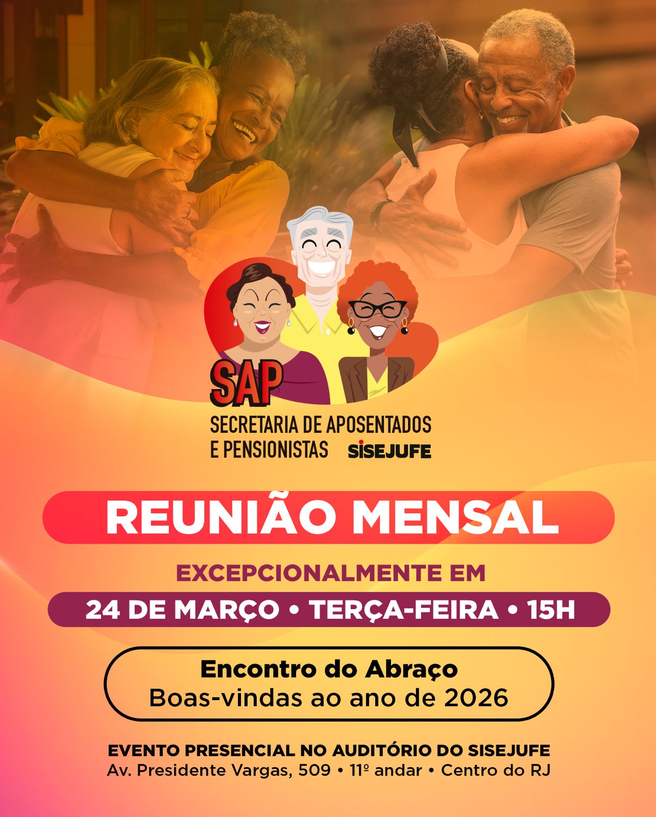A Secretaria de Aposentados e Pensionistas realizará, excepcionalmente neste mês, seu encontro na penúltima terça-feira, dia 24 de março, às 15h.