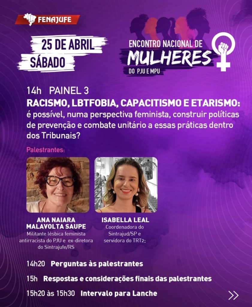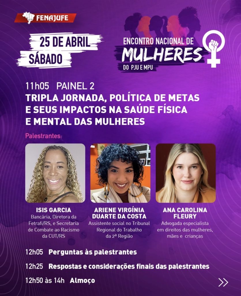 O encontro reunirá mulheres de todos os estados, que juntas vão debater temas importantes, como o feminismo e o movimento sindical: da criação de coletivos à paridade de gênero e à participação efetiva na luta contra o machismo e o patriarcado; tripla jornada, política de metas e seus impactos na saúde física e mental das mulheres; racismo, LBTfobia, capacitismo e etarismo: é possível, numa perspectiva feminista, construir políticas de prevenção e combate unitário a essas práticas dentro dos tribunais?.