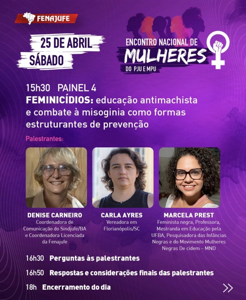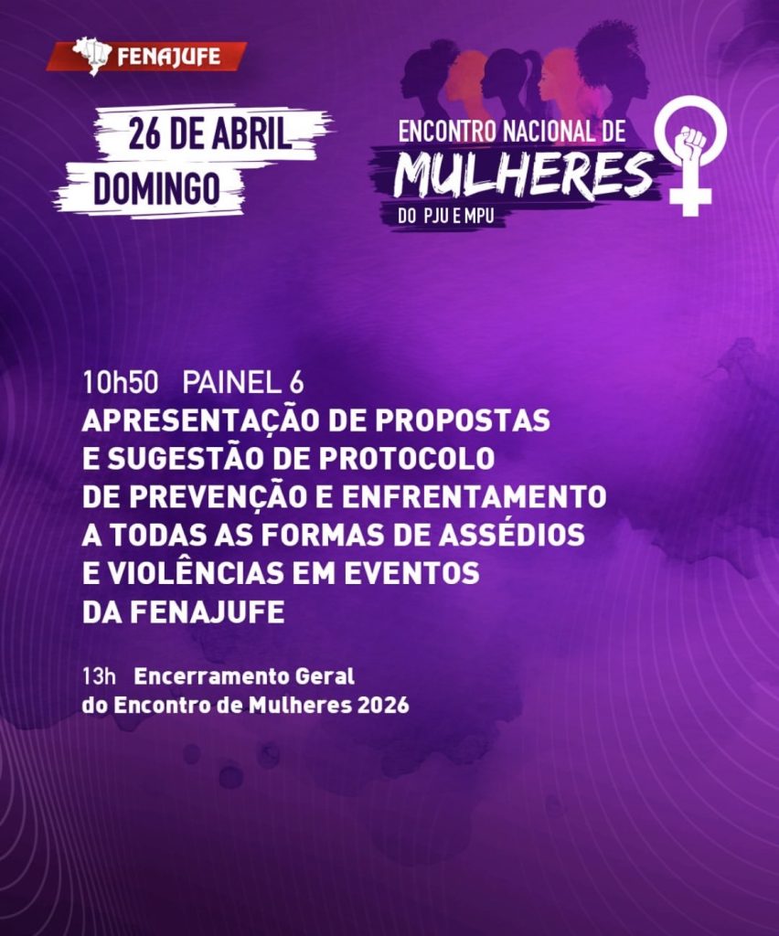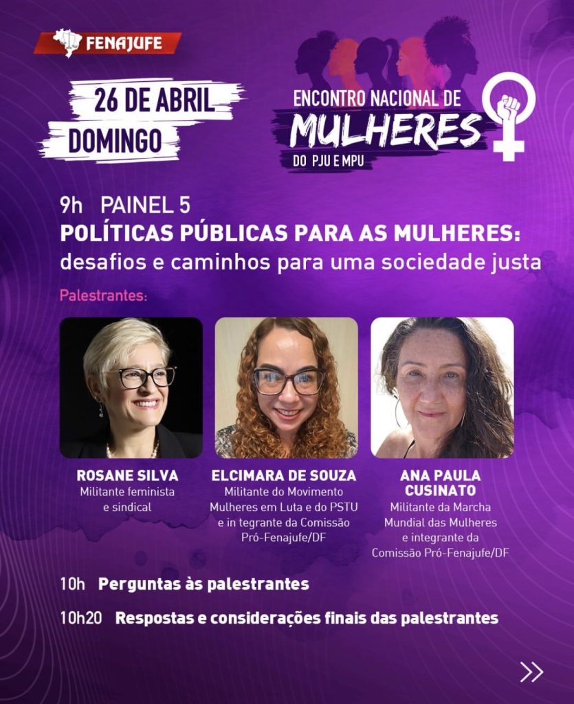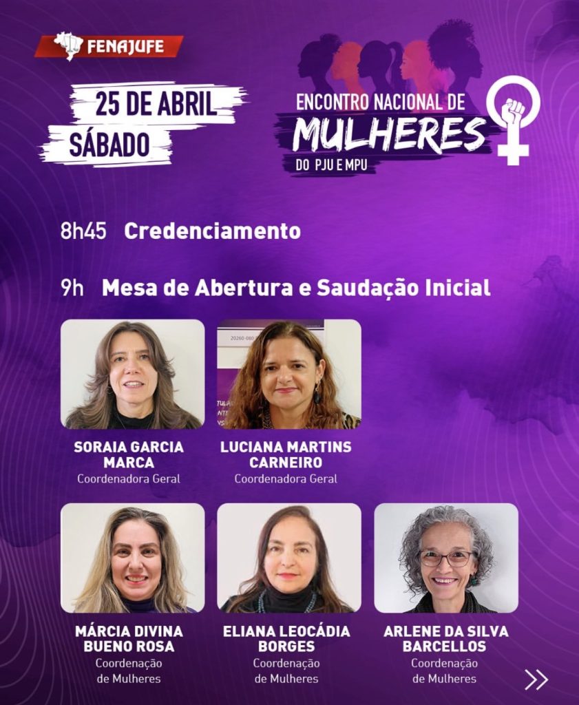 Pelo Sisejufe, participarão presencialmente a secretária de Mulheres, Anny Figueiredo, e a diretora Renata Oliveira. As diretoras Fernanda Lauria, que é também coordenadora da Federação, Vera Pinheiro e Michelle Maranhão acompanharão a atividade de forma virtual. A presidente Lucena Pacheco Martins integrará a programação como palestrante e a diretora Soraia Marca, que é coordenadora-geral da Fenajufe, estará na Mesa de Abertura.