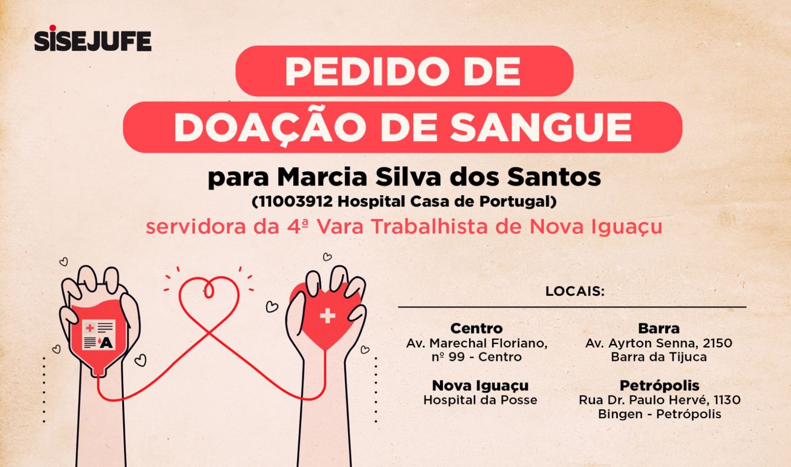 A servidora da 4ª Vara Trabalhista de Nova Iguaçu, Marcia Silva dos Santos, precisa de transfusões de sangue frequentemente, em decorrência de leucemia, e você pode ser uma importante ajuda! Marcia está internada no Hospital Casa de Portugal, e o Sisejufe disponibiliza aos servidores e servidoras que puderem doar, as informações de como realizar a doação. Quem não puder, é importante que ajude a compartilhar a matéria.
