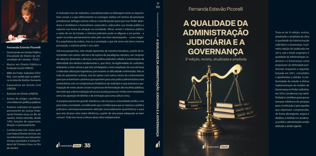 A doutoranda em Direito Público da Universidade de Coimbra, mestra em Direito Público e Evolução Social e especialista em Poder Judiciário (MBA/FGV), Fernanda Estevão Picorelli, também servidora sindicalizada ao Sisejufe, apresenta a 3ª edição, atualizada e ampliada, da obra “A Qualidade da Administração Judiciária e a Governança”. A primeira edição, publicada em 2013 sob o título “A Qualidade da Administração Judiciária e a Governança como propulsores da efetividade jurisdicional”, inaugurou uma reflexão pioneira sobre a relação entre governança, gestão judiciária e efetividade da prestação jurisdicional. A segunda edição, lançada em 2021, consolidou e aprofundou o debate, acompanhando a evolução normativa e institucional do Poder Judiciário brasileiro.