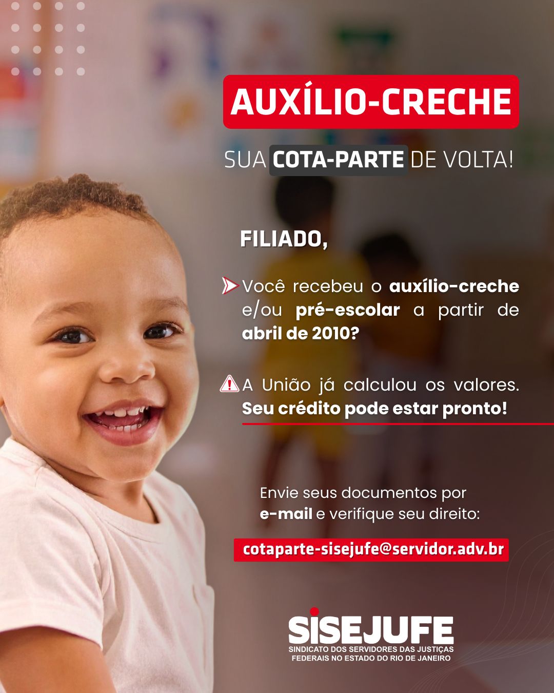 O Sisejufe informa que os servidores que receberam auxílio-creche ou auxílio pré-escolar com desconto de cota-parte, a partir de abril de 2010, podem ter direito à restituição dos valores descontados indevidamente.