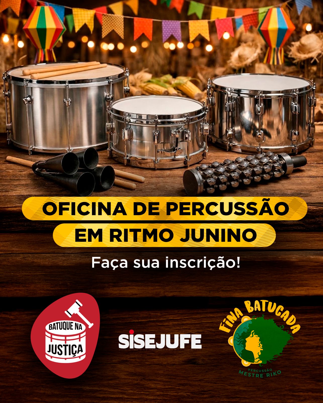 O Sisejufe e a Fina Batucada convidam as servidoras e os servidores sindicalizados para participar do curso de percussão do Batuque na Justiça, que inicia neste sábado (14/3) o módulo Junino.