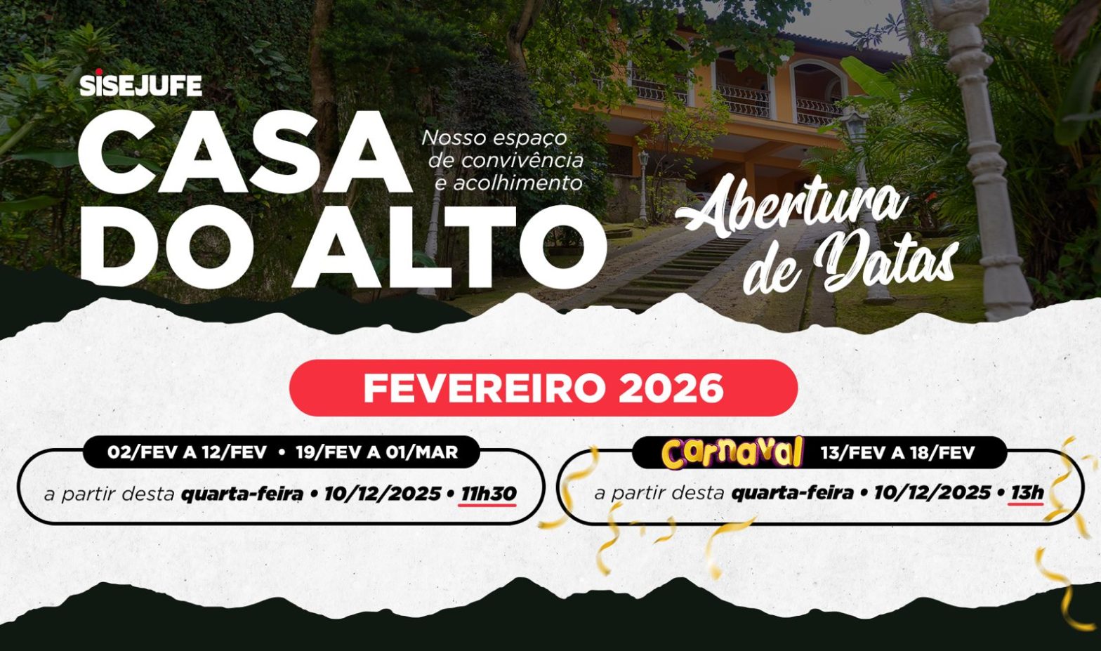 Nesta quarta-feira, 10 de dezembro, o Sisejufe abrirá as reservas para o mês de FEVEREIRO na Casa do Alto. O período de funcionamento da Casa em fevereiro será de 2/2 a 1/3. Durante o carnaval, funcionará entre os dias 13 a 18 de fevereiro.