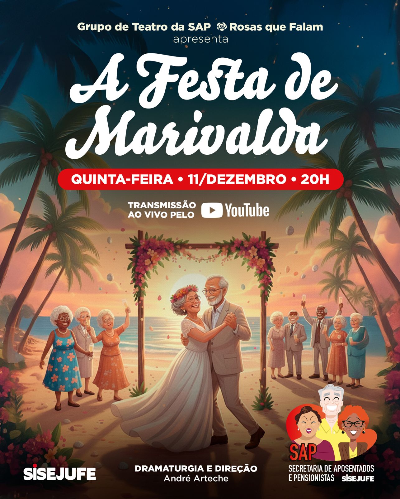Está chegando o momento tão esperado pelos alunos do curso de teatro do Sisejufe: a apresentação de fim de ano! O espetáculo virtual “A Festa de Marivalda”, do grupo de teatro da SAP, “Rosas que Falam”, será na quinta-feira, dia 11 de dezembro, às 20h. Você é nosso convidado! A transmissão será ao vivo pelo nosso canal no YouTube.