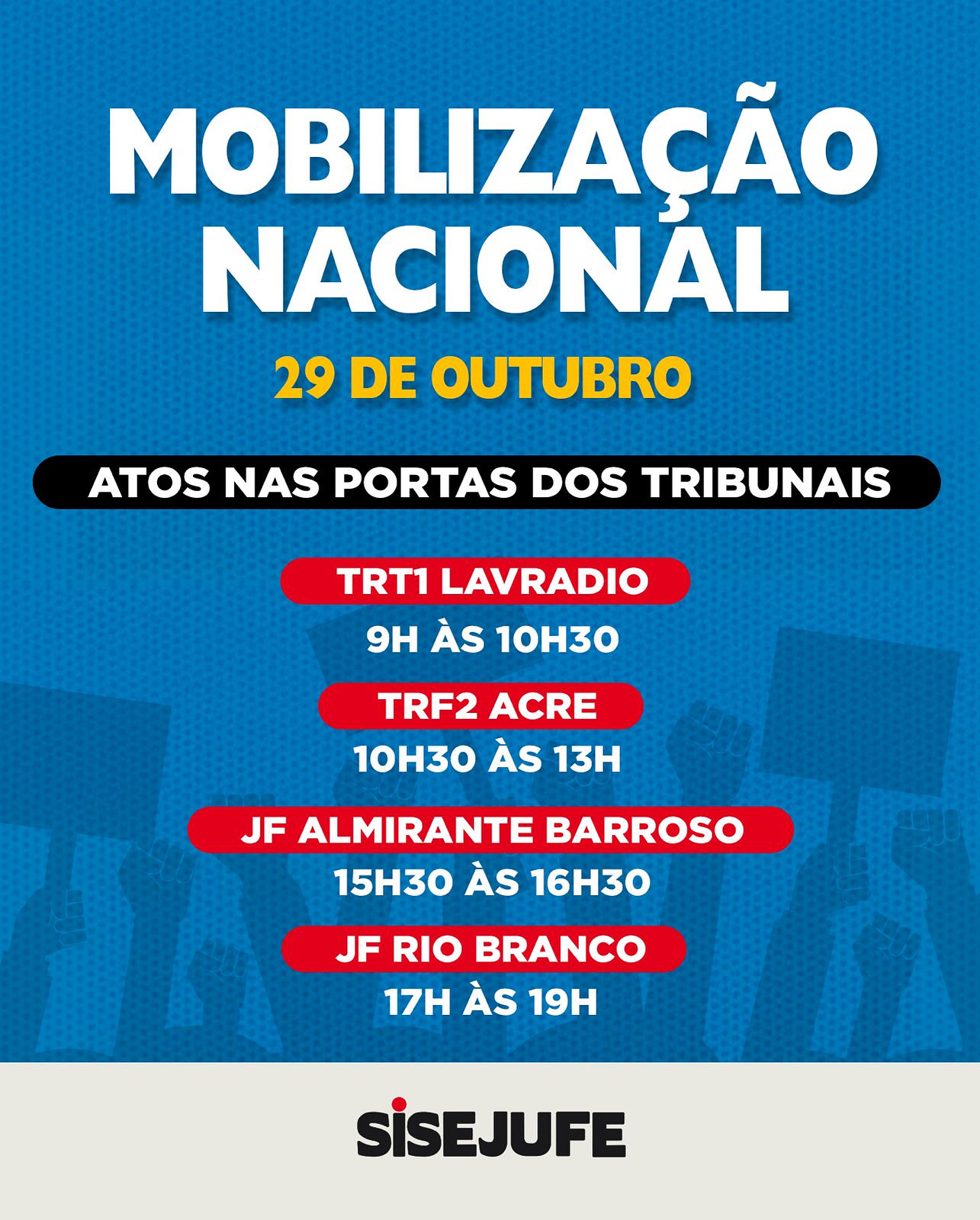 O Sisejufe estará presente na manifestação e também realizará atos em frente aos tribunais regionais. E é justamente nestes atos nos regionais que a participação de cada servidora e cada servidor será fundamental!!!!