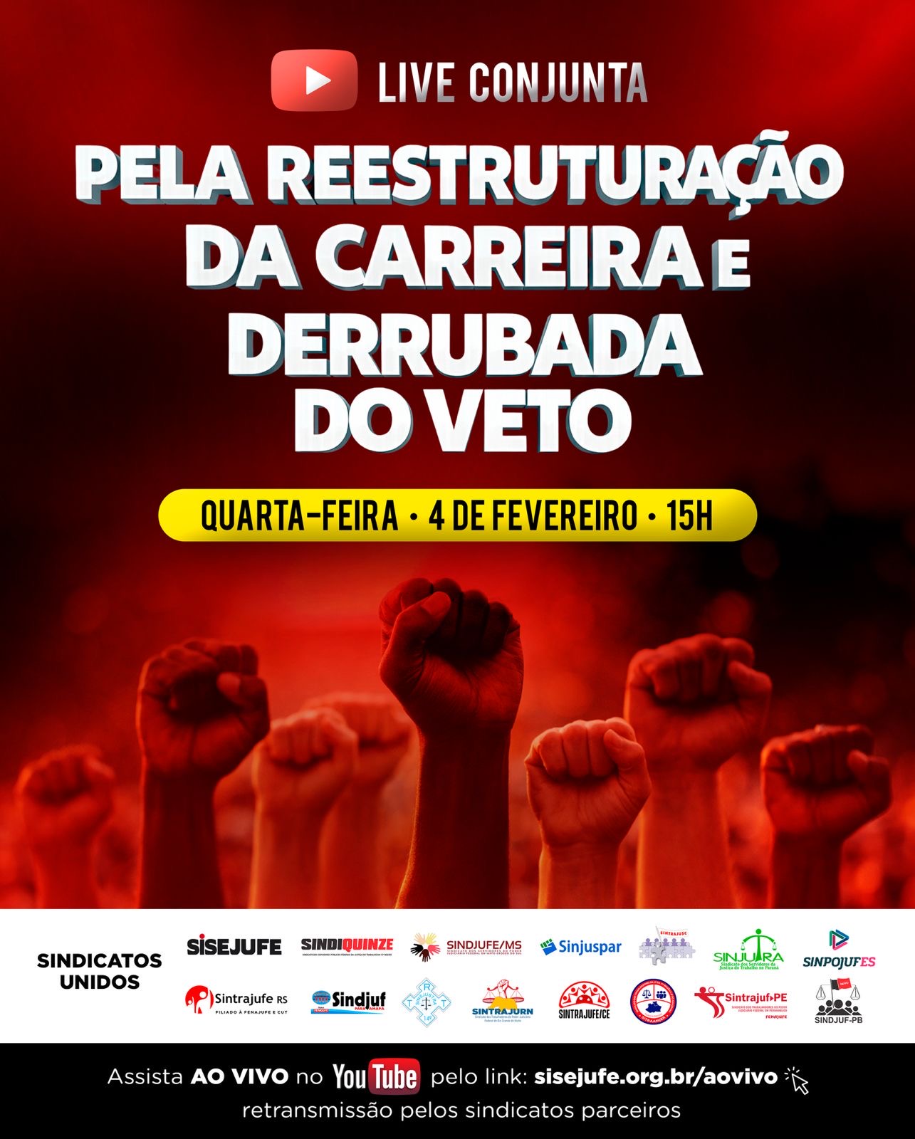 O Sisejufe convoca as servidoras e os servidores do Poder Judiciário da União a participarem da live nacional que será realizada no dia 4 de fevereiro, a partir das 15h, como parte da mobilização chamada pela Fenajufe pela reestruturação da carreira e para pressionar o Congresso Nacional pela derrubada do Veto nº 45/2025. A atividade está sendo organizada em conjunto com sindicatos de base de todo o país.