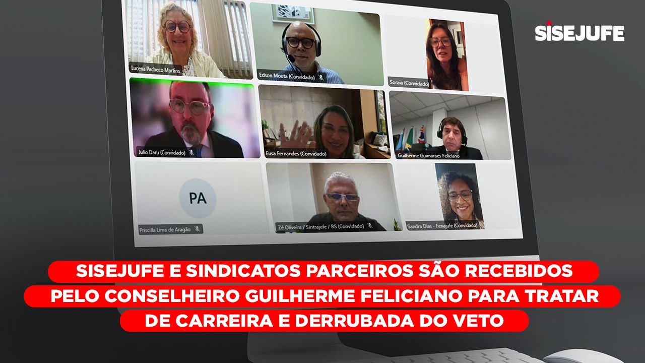 Representantes do Sisejufe e de sindicatos parceiros participaram, nesta quarta-feira (21/1), de reunião virtual com o conselheiro do Conselho Nacional de Justiça (CNJ) Guilherme Feliciano, coordenador do Fórum de Gestão e Carreira dos Servidores. O encontro, marcado a pedido do Sisejufe, teve como eixo central a busca por apoio institucional junto ao ministro Edson Fachin, presidente do Supremo Tribunal Federal (STF) e do CNJ, para o debate sobre a reestruturação da carreira e para a derrubada do Veto nº 45/2025.