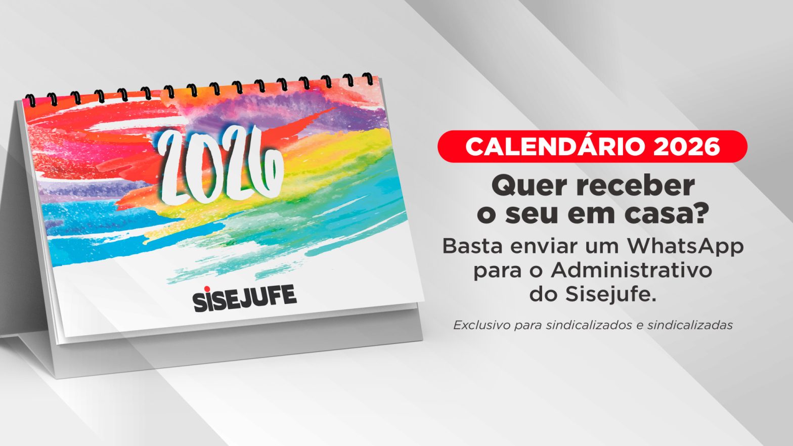 O Sisejufe inicia, nesta quinta-feira (4/12), o cadastro de sindicalizados e sindicalizadas que desejam receber em casa o Calendário 2026. Os filiados estão recebendo um e-mail do sindicato com todas as orientações. Mas se você é sindicalizado, já te adiantamos o que é necessário para receber o seu calendário. Para confirmar o envio, basta mandar uma mensagem até o dia 10 de dezembro para o WhatsApp do Administrativo — (21) 96784-6781 — com as seguintes informações: