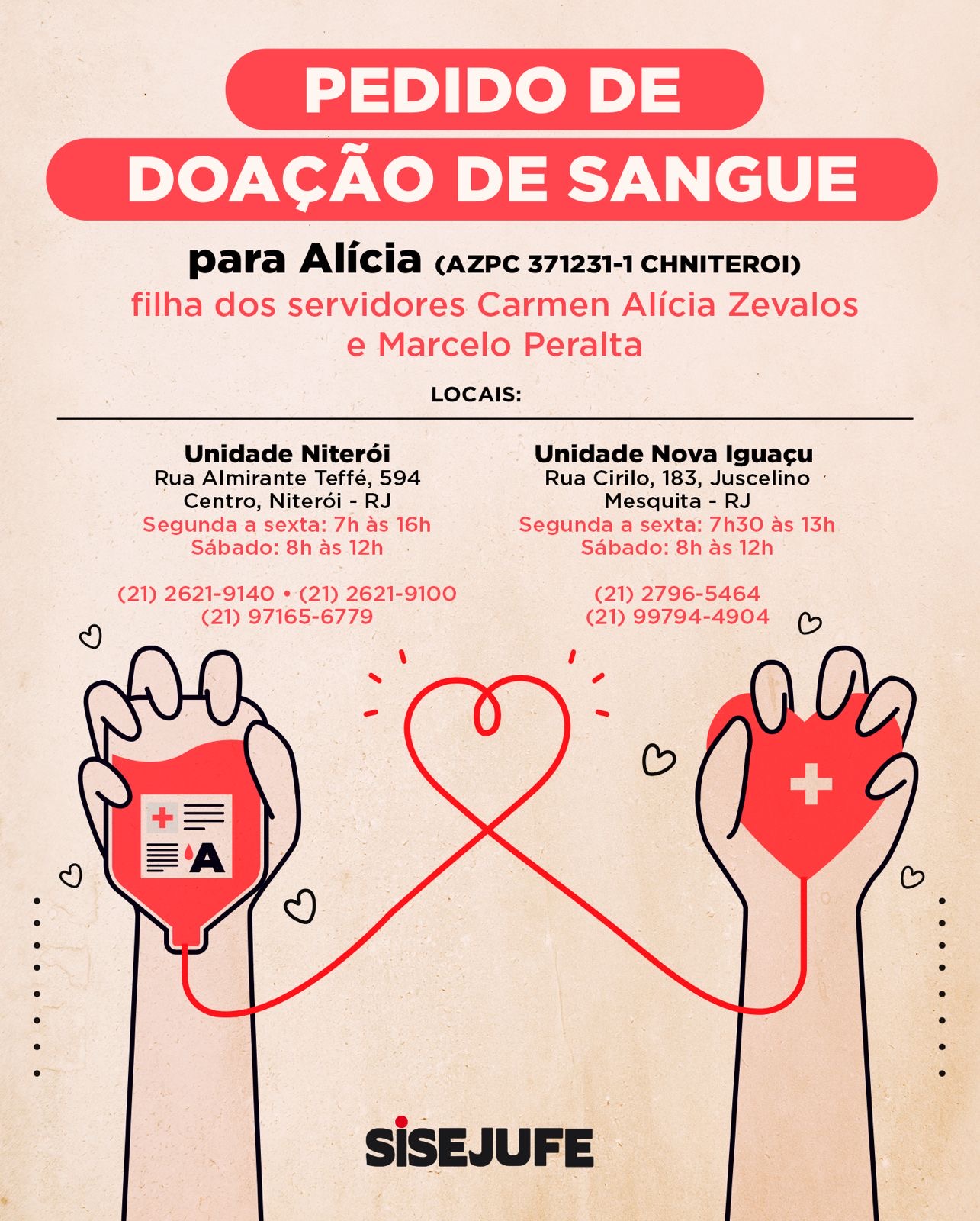 O Sisejufe faz um chamado à categoria para ajudar a pequena Alícia, filha dos servidores sindicalizados Carmen Alícia Zevalos e Marcelo Peralta. A menina precisa, com urgência, de doação de sangue. A mobilização é fundamental para garantir o tratamento e reforça a importância da empatia em momentos delicados como este.