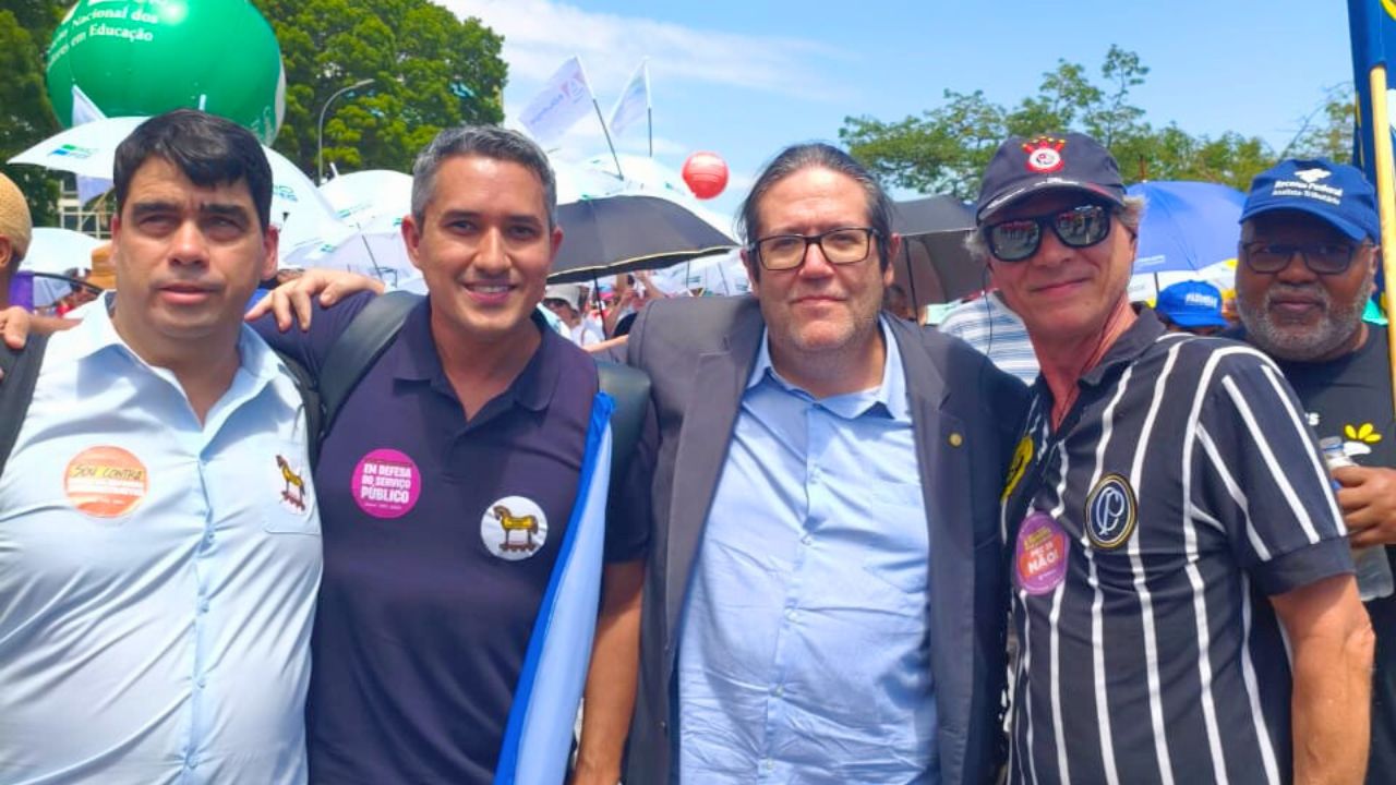 O diretor do Sisejufe, João Victor Albuquerque, Alexandre Ojaf (TRT/SP), Wallace Ojaf (Sintrajufe/PE) e o diretor do Sisejufe, Ricardo Azevedo, durante a Marcha Nacional do Serviço Público (Reprodução/acervo Sisejufe)