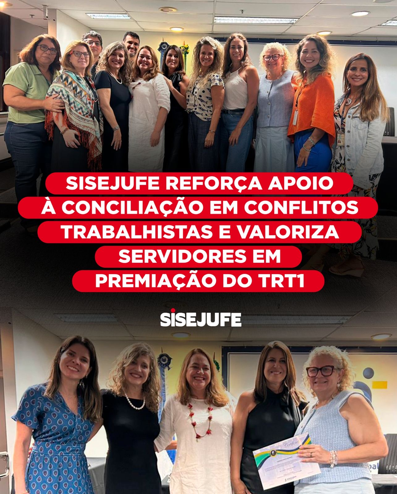 O Sisejufe marcou presença na cerimônia de premiação do projeto “Somos Conciliadores”, promovido pelo Tribunal Regional do Trabalho da 1ª Região (TRT1), nesta segunda-feira (16/3). A iniciativa reconheceu varas, instituições, servidores(as) e magistrados(as) que se destacaram, ao longo de 2025, na promoção de soluções consensuais de conflitos trabalhistas.