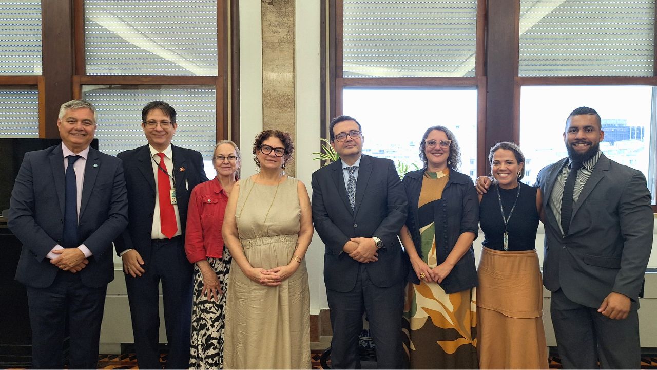 O presidente do TRT 1, desembargador Roque Lucarelli Dattoli, a presidente da Amatra 1, Dra. Daniela Muller, o diretor-geral do TRT 1, José Márcio da Silva Almeida, os membros da Comissão de Aprovados no Concurso de Analistas do Tribunal Regional do Trabalho da 1ª Região, Bruno Costa e Lia de Souza, a presidente do Sisejufe, Lucena Pacheco Martins, o vice-presidente, Ricardo Quiroga, e a diretora do sindicato, Helena Cruz, durante reunião (Reprodução/acervo Sisejufe)