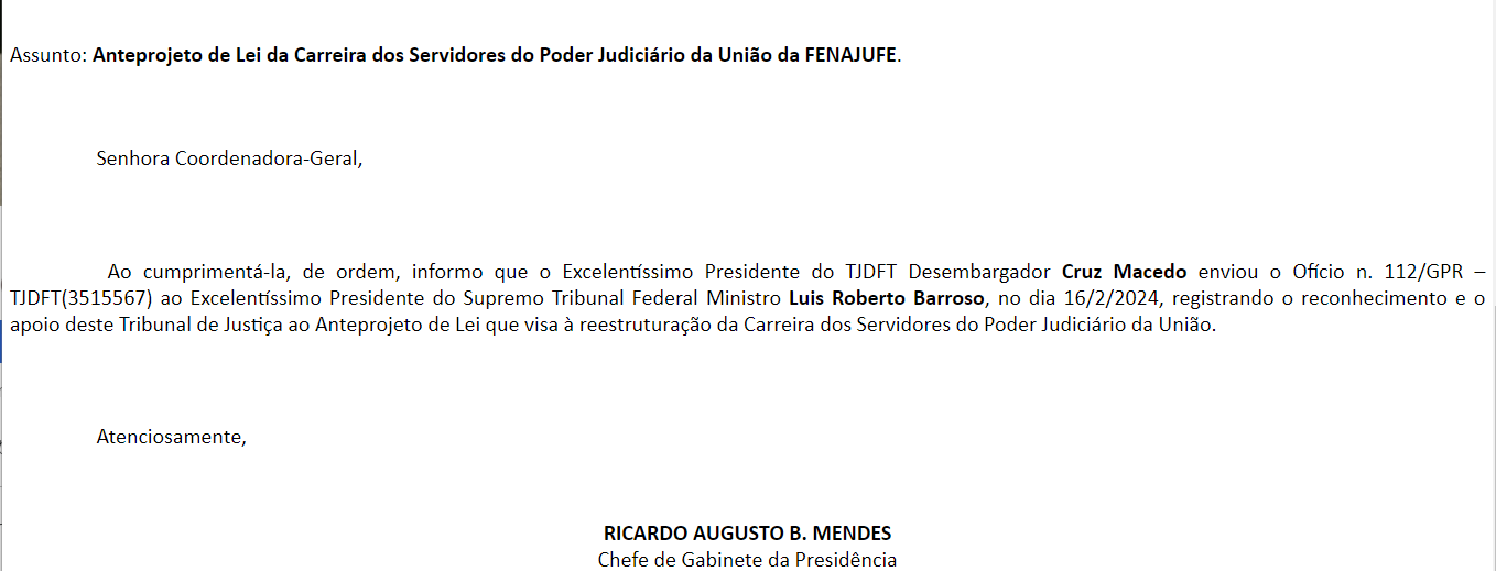 A Fenajufe tem dedicado todos os esforços na busca pela tão aguardada reestruturação da carreira das servidoras e servidores. Nesse sentido, já buscou apoio e diálogo junto ao STF, CNJ, TSE e Conselho da Justiça Federal (CJF), com a expectativa de que as autoridades responsáveis acolham a proposta da categoria e participem ativamente dos debates nos encontros do Fórum de Carreira do CNJ. Assim, a declaração de apoio do TJDFT representa mais uma significativa conquista da Fenajufe e dos Sindicatos de base em direção ao alcance desse objetivo que visa proporcionar melhores condições de trabalho e valorização à categoria.