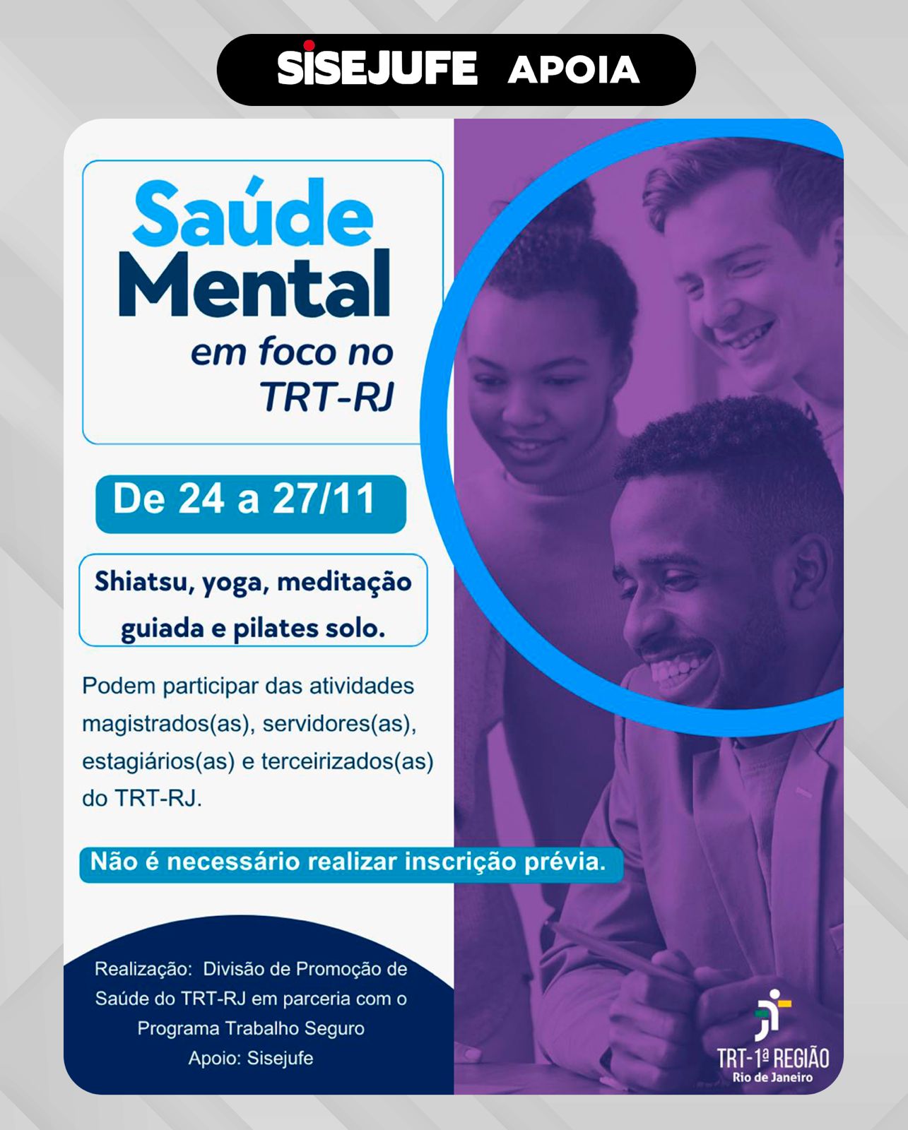 O Tribunal Regional do Trabalho da Primeira Região (TRT1) realizará a campanha “Saúde Mental em Foco – cuidar de si também é parte do trabalho”, com apoio do Sisejufe. A iniciativa tem como objetivo promover o bem-estar emocional e incentivar a construção de ambientes de trabalho mais saudáveis e equilibrados. “Cuidar da saúde mental é essencial para manter a qualidade de vida e o equilíbrio nas relações interpessoais e profissionais. Estresse, ansiedade e depressão podem impactar o desempenho laboral e até gerar repercussões físicas quando não recebem a devida atenção”, ressalta o informativo sobre o evento.