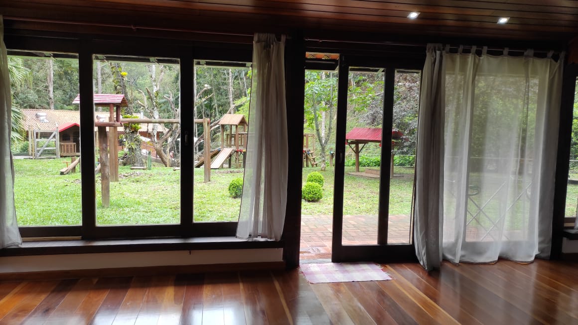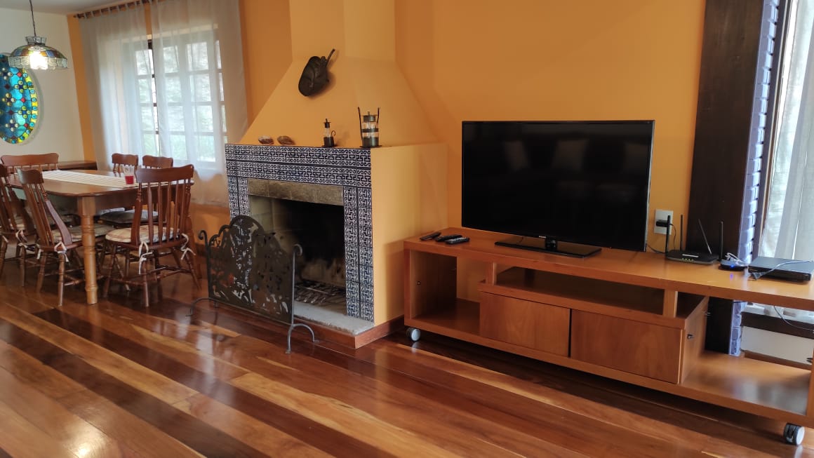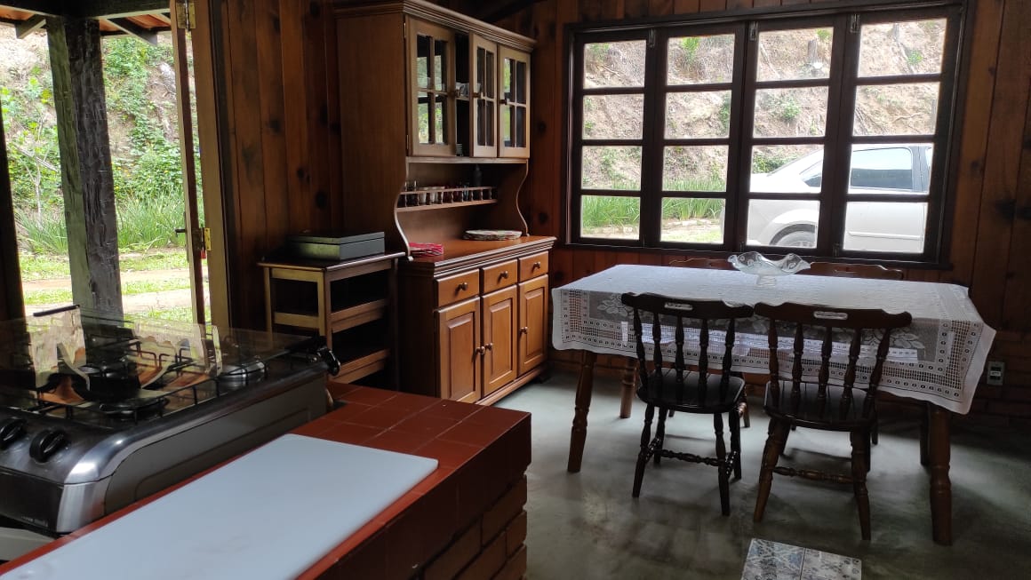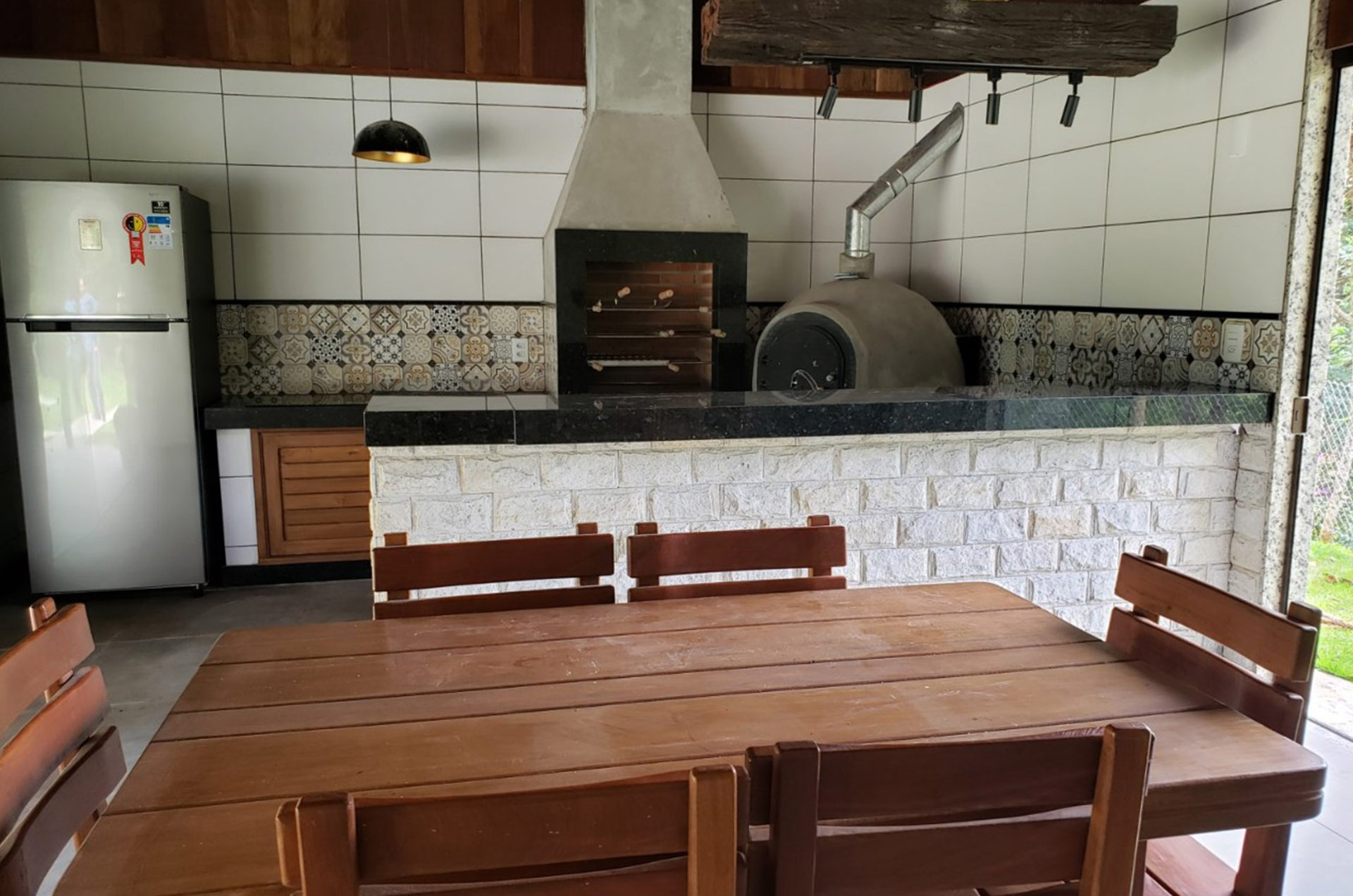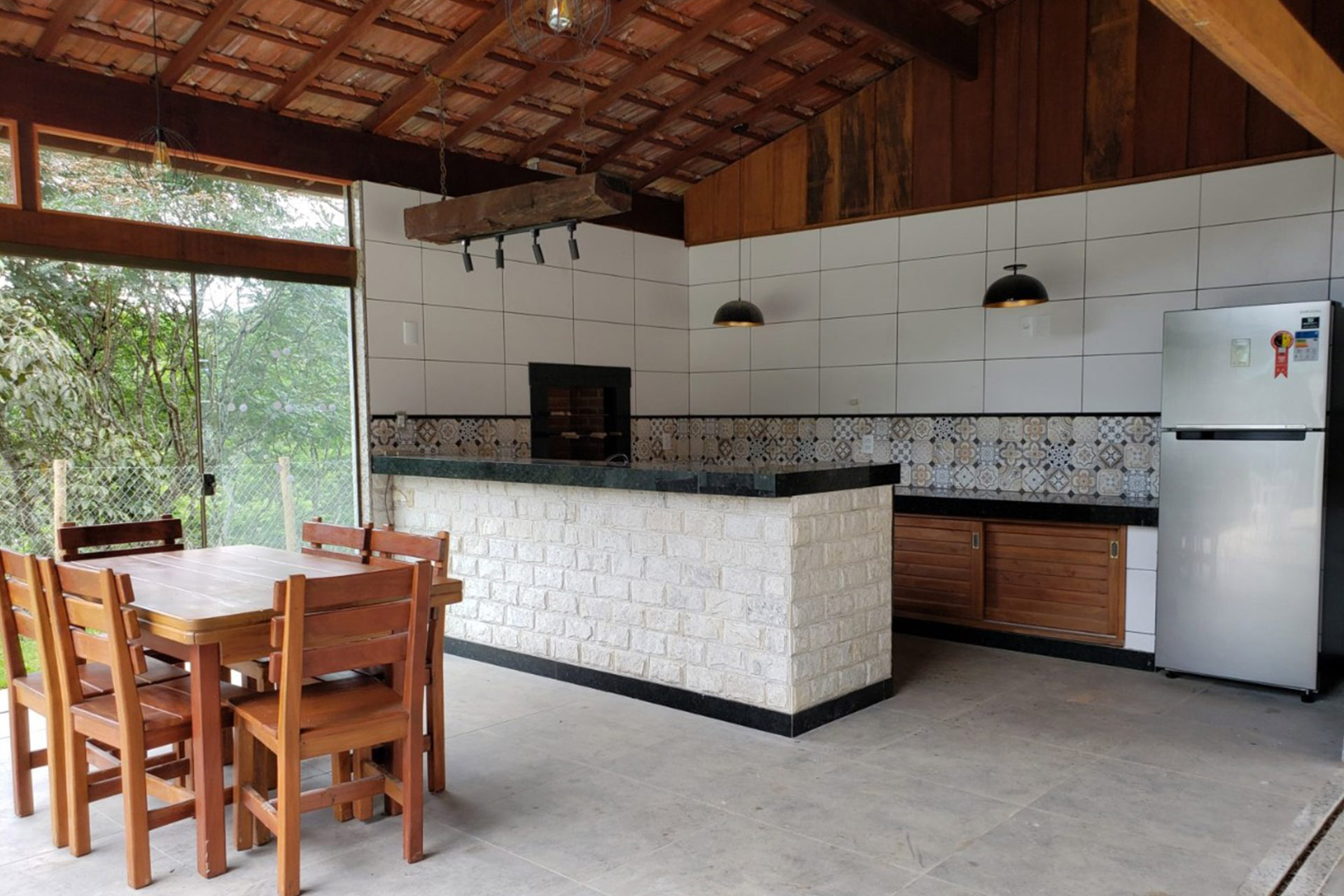 A Casa do Lago conta com sala, sala de estar, dois quartos sendo um suíte, cozinha com bancada e também oferece uma lareira.